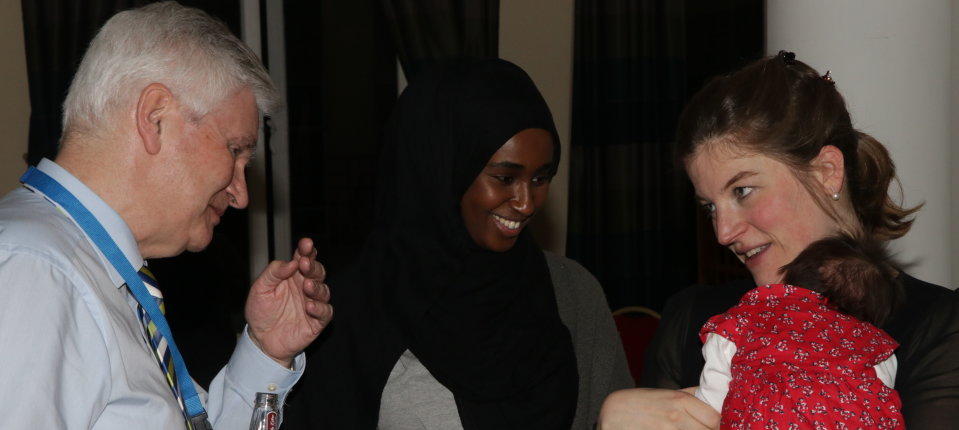 Professor Wolfgang Lubitz (left), Kaltum (middle) and Maxie (right) with the youngest conference guest (Kira) at the RSC EPR meeting we hosted April 2018.