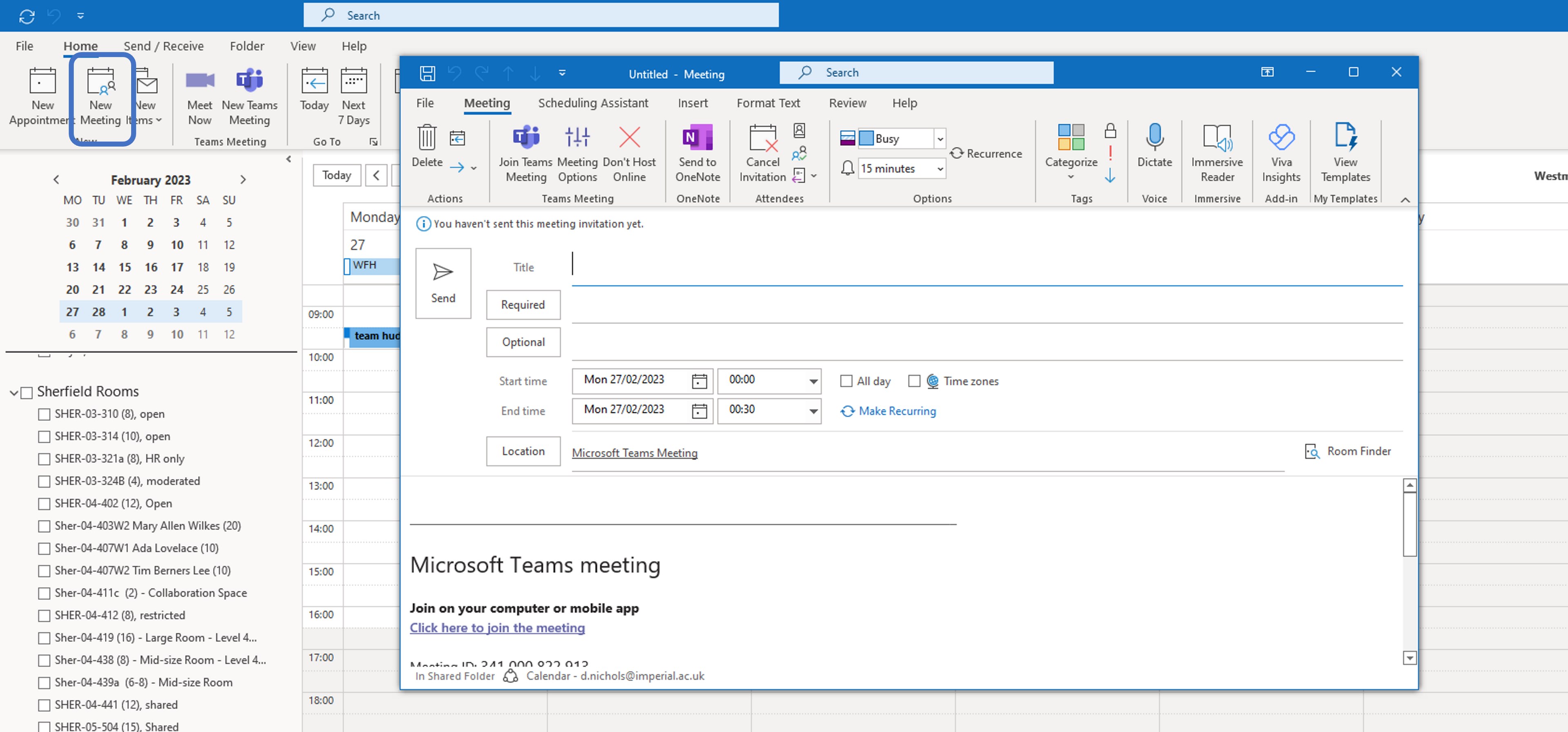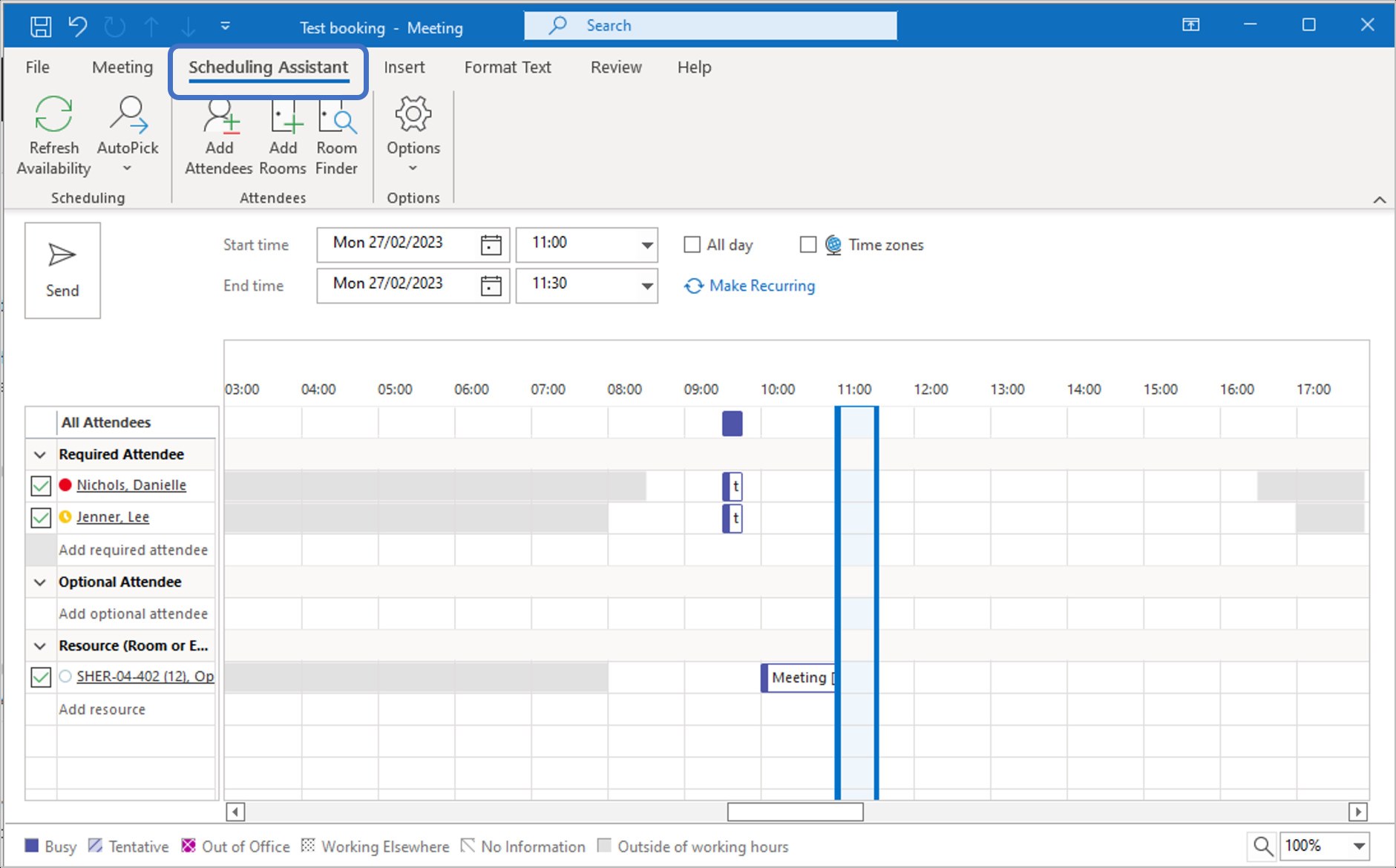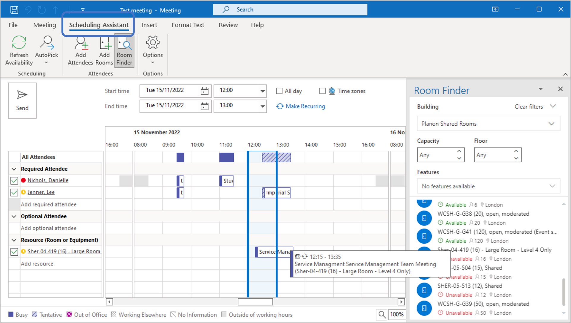 - Once you have selected your room, you can use the Scheduling Assistant option to check that the room and any participants you have added are available. If not, adjust the time to find a suitable slot, or try picking another room.