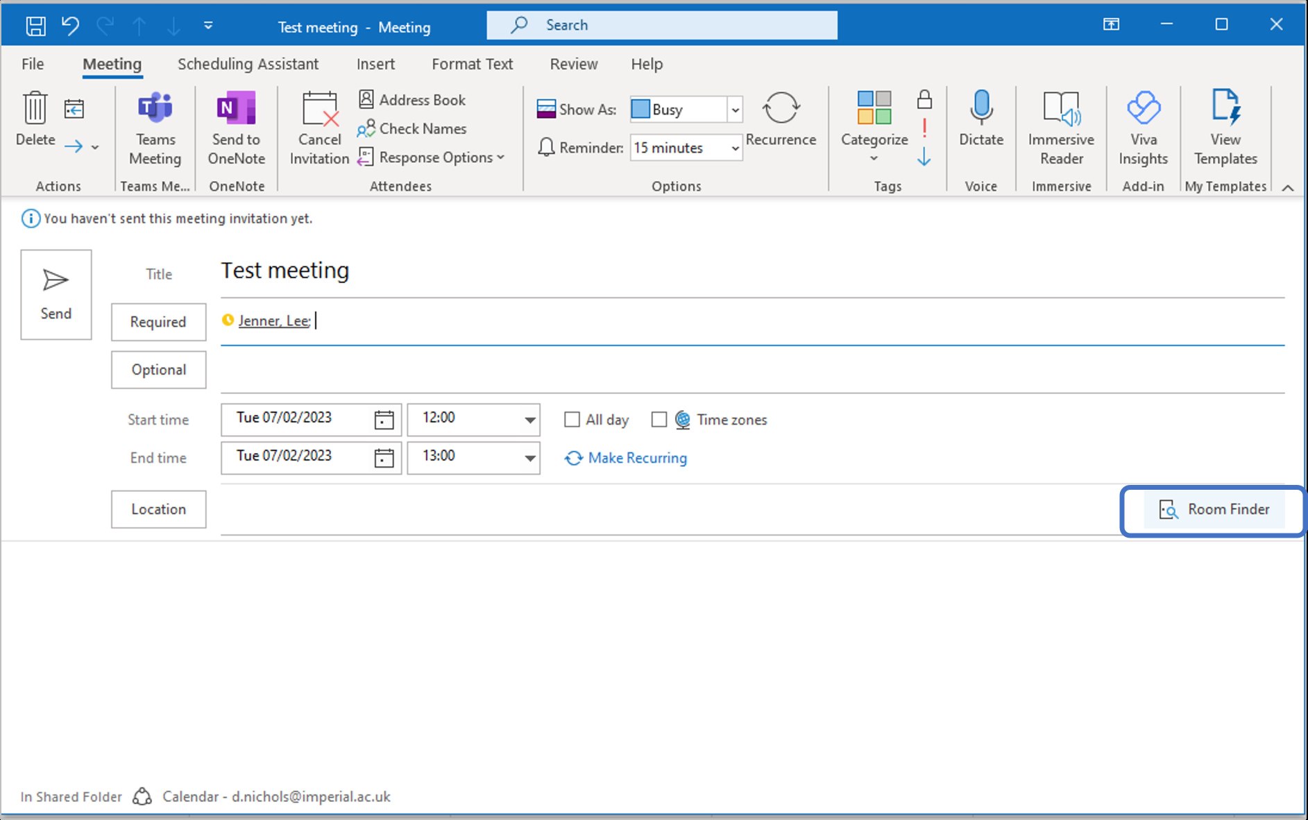 - If you would like to invite other attendees, click in the 'Required' field and start typing a name.