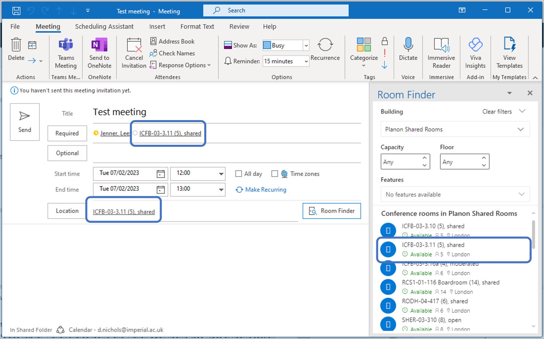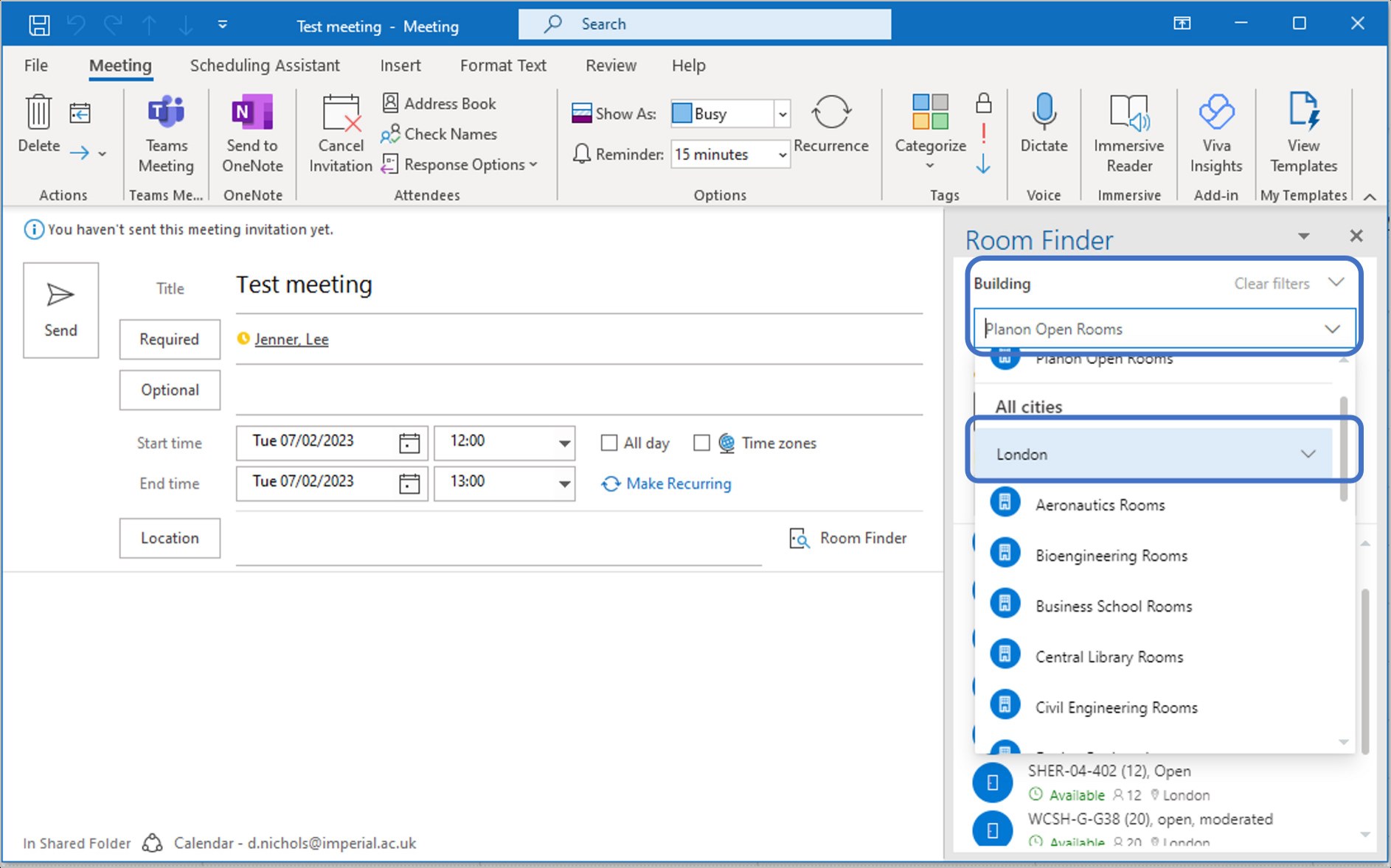 - Under the room name, you can see whether a room is 'Available' or 'Unavailable' at the time you have selected. If the room you want is available, click on it and it will be populated in the 'Required' and 'Location' fields in your meeting invitation.