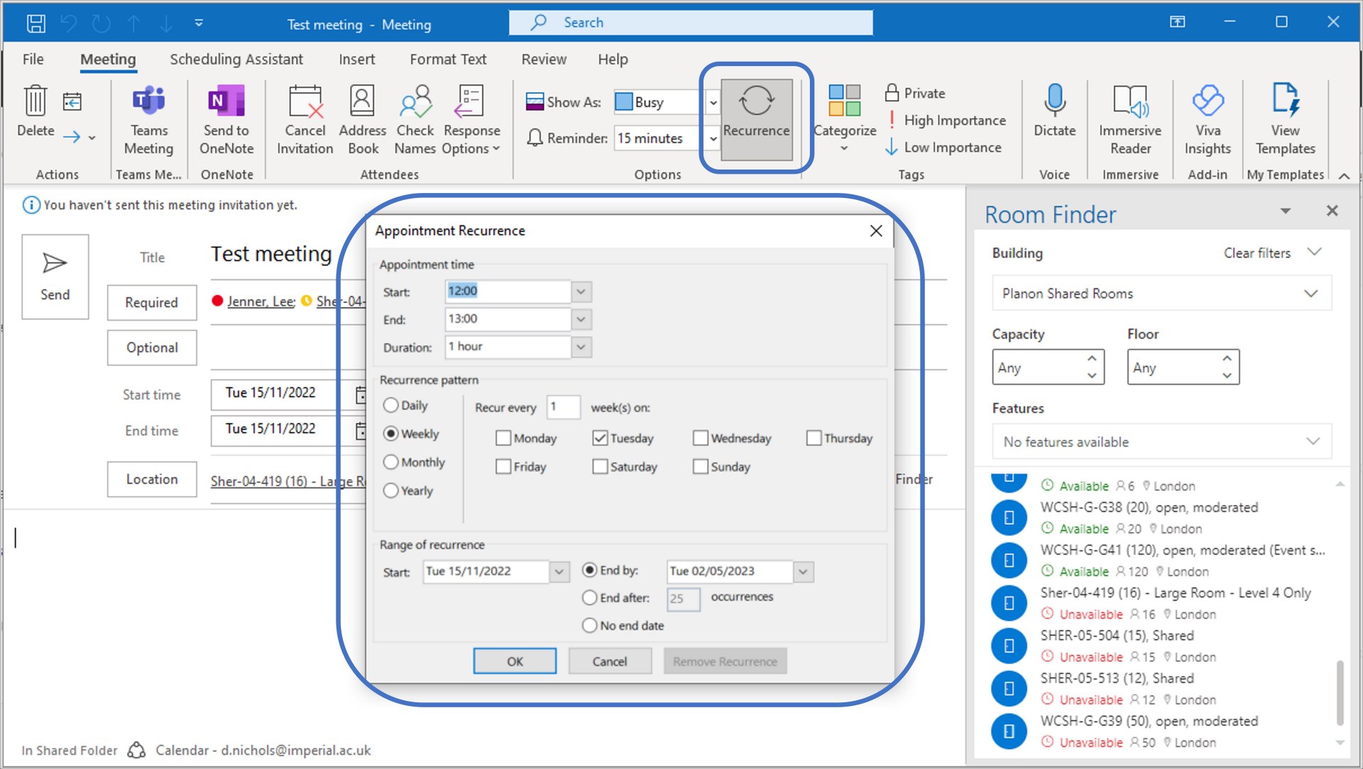 - If you want the same meeting room for the whole recurrence, please first check if the meeting room is available for each of your meeting instances. If it is free, you can add the room to your meeting as you normally would and you will get a confirmation email from Microsoft Outlook. If you attempt to book a room that is not free for all your instances of the recurring meeting, no room bookings will be accepted.