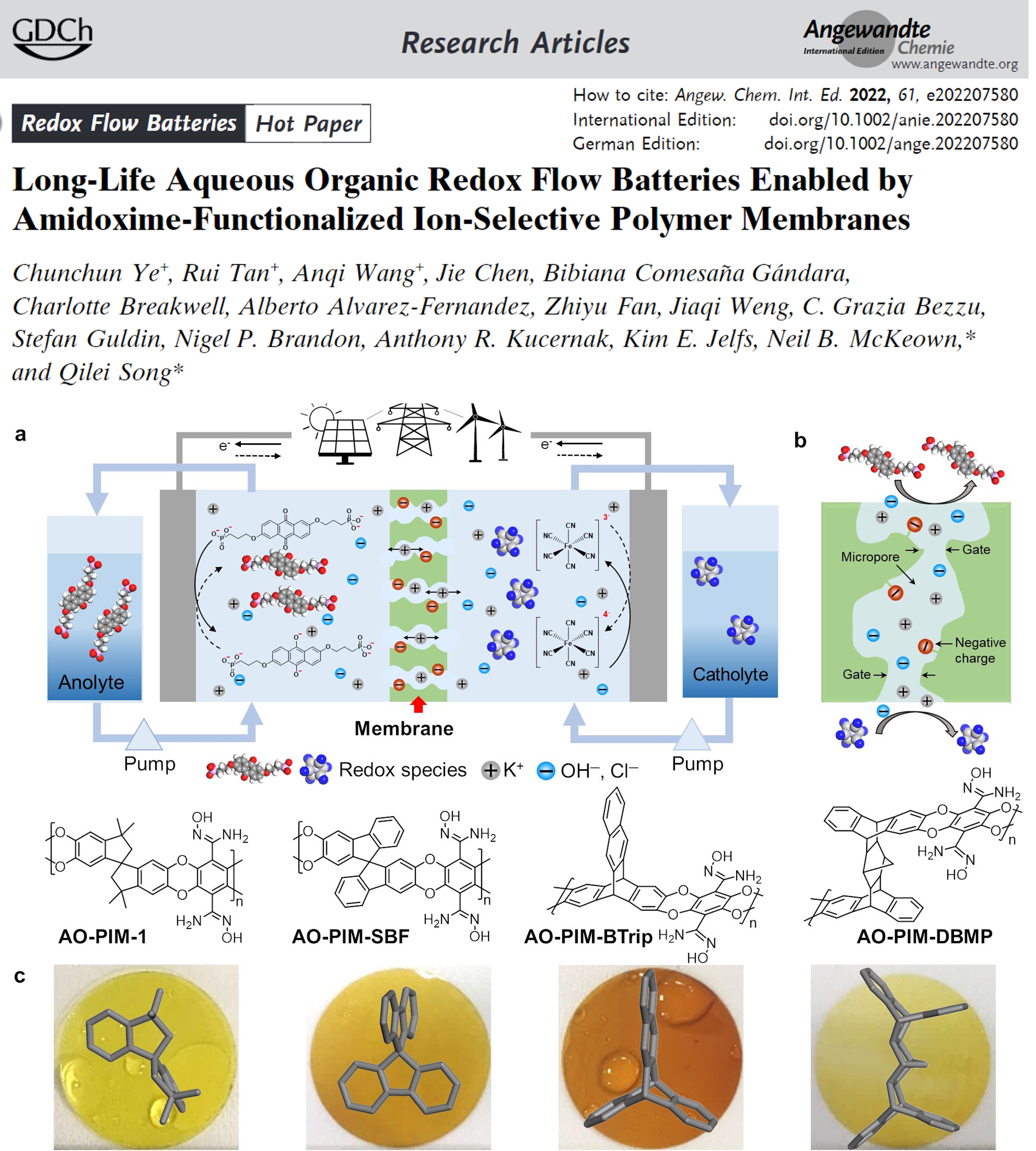Our latest paper on ion-selective PIM membranes for aqueous organic flow batteries for energy storage. Great work led by Dr Anqi Wang, and collaboration with teams across Imperial, UCL, and Edinburgh. Link to the paper: https://onlinelibrary.wiley.com/doi/full/10.1002/adma.202210098