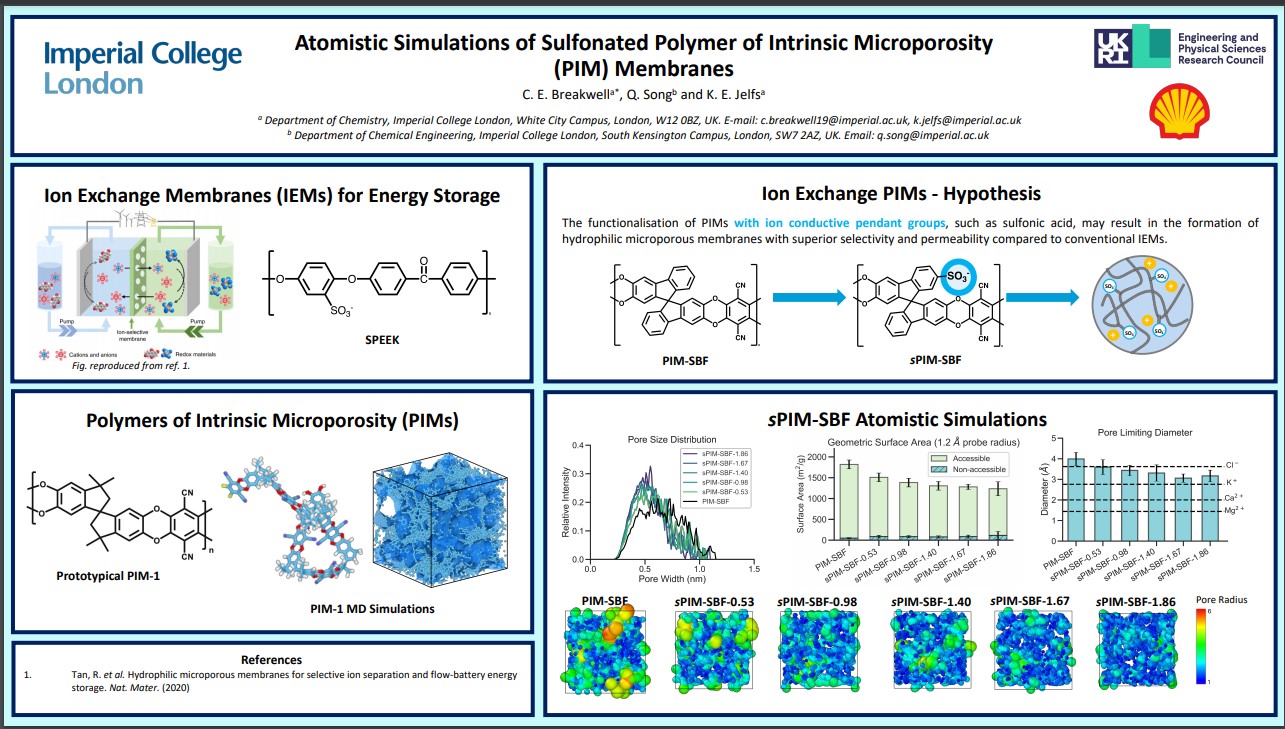 Charlotte Breakwell attended the 26th Summer School (2021) organized by the Collaborative Computational Project for Computer Simulation of Condensed Phases (CCP5), and presented her research on molecular simulation of PIM membranes: 'Atomistic Simulations of Sulfonated Polymer of Intrinsic Microporosity (PIM) Membranes'. Congratulations on winning the poster competition! Read the details of the summer school on the STFC website.