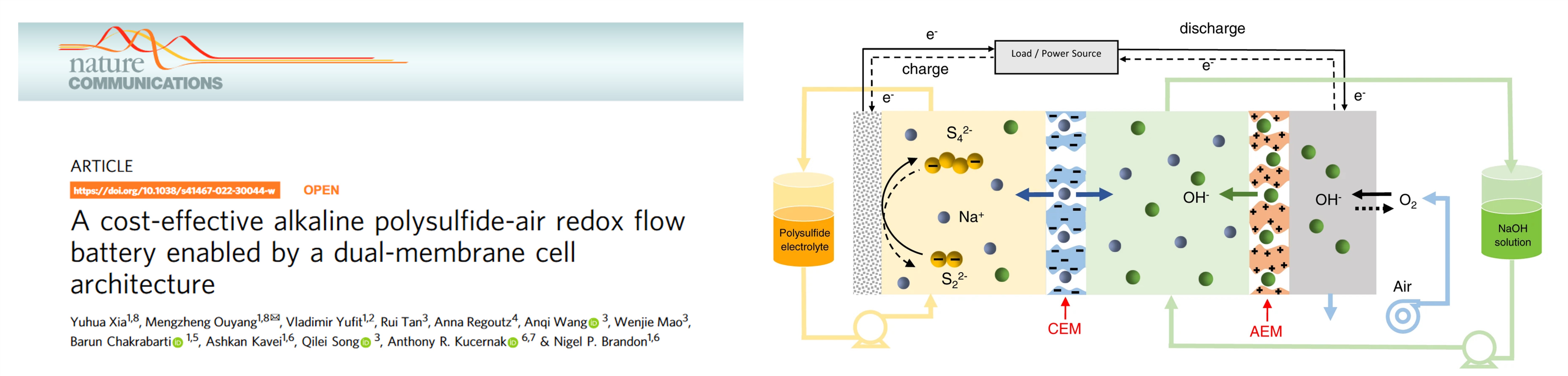 A new paper published in Nature Communications, reporting Polysulfide-Air Redox Flow Batteries (PSA RFBs). A great collaboration with the group of Prof Anthony Kucernak and Prof Nigel Brandon.