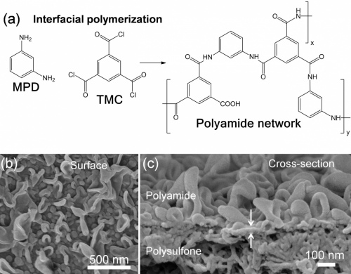Polyamide thin film composite (PA-TFC) membranes are synthesized from interfacial polymerization via the established polymer chemistry (a) as shown in the figure below. The SEM iamges show the morphology of surface (b) and cross-section (c) of ultrathin polyamide thin films supported on polysulfone membranes. These nanofilm membranes show relatively higher water permeance and high rejection of ions in water desalination applications.