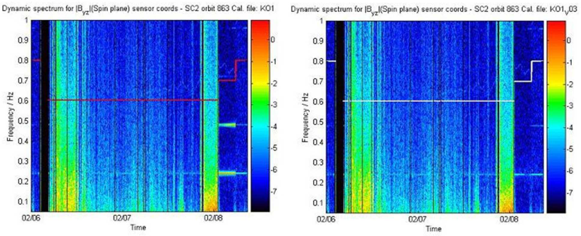 Callibration In the first plot, unacceptable levels of spin-frequency signal and harmonics in Range 3 can be seen.  The fundamental of the spin frequency is 0.25 Hz (1 revolution of the spacecraft approximately every 4 seconds). This indicates that the calibration parameters are not optimised. After adjustment, the spin-tone is reduced to an acceptable level, as shown in the second plot.