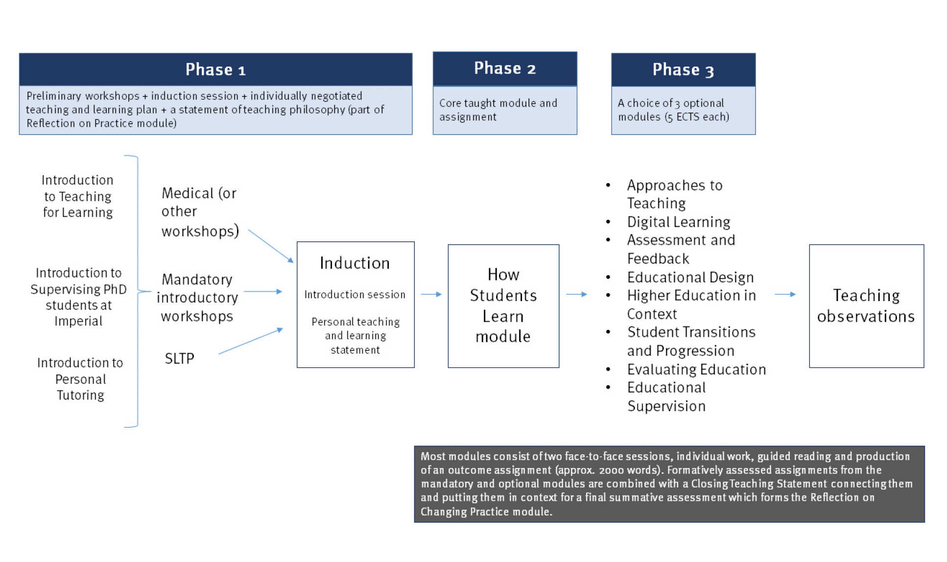 After completing phase 1, students attend an induction session and prepare an initial statement of teaching philosophy. Then students attend the core module How Students Learn which gives them theoretical background on which they can build further knowledge from optional modules in Phase 3. In Phase 3 students choose 3 modules from a list to total 15 ECTS. The topics offered will vary from year to year, and not all topics will be offered every year. Most topics consist of two face to face sessions and are followed by an individual assignment supported by directed reading. Assignments are submitted for formative feedback before being collated and submitted with a second statement of teaching philosophy for final summative assessment. Outside of the modules students will also have to complete teaching and peer observations.