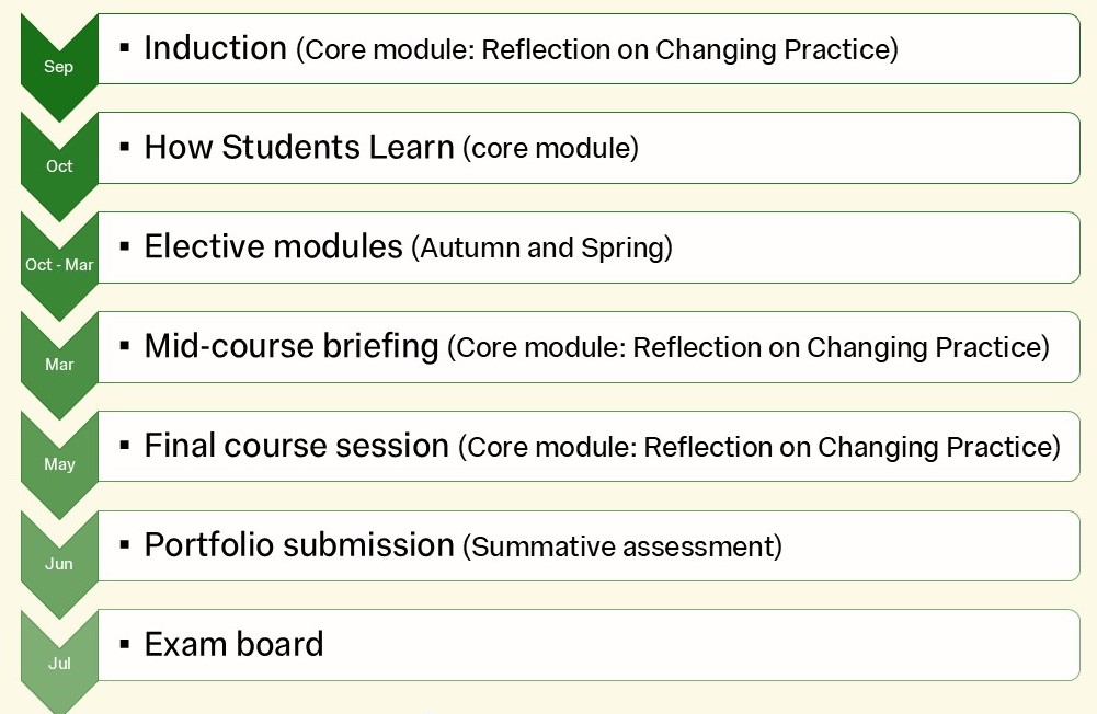 - Reflection on Changing Practice: This module includes touchpoint sessions along the programme, two reflective teaching statements, and tutor and peer teaching observations.