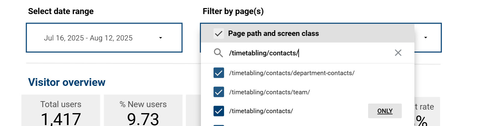 Enter the URL (without https://www.imperial.ac.uk) to filter the report to a particular page e.g. /timetabling/about-us/