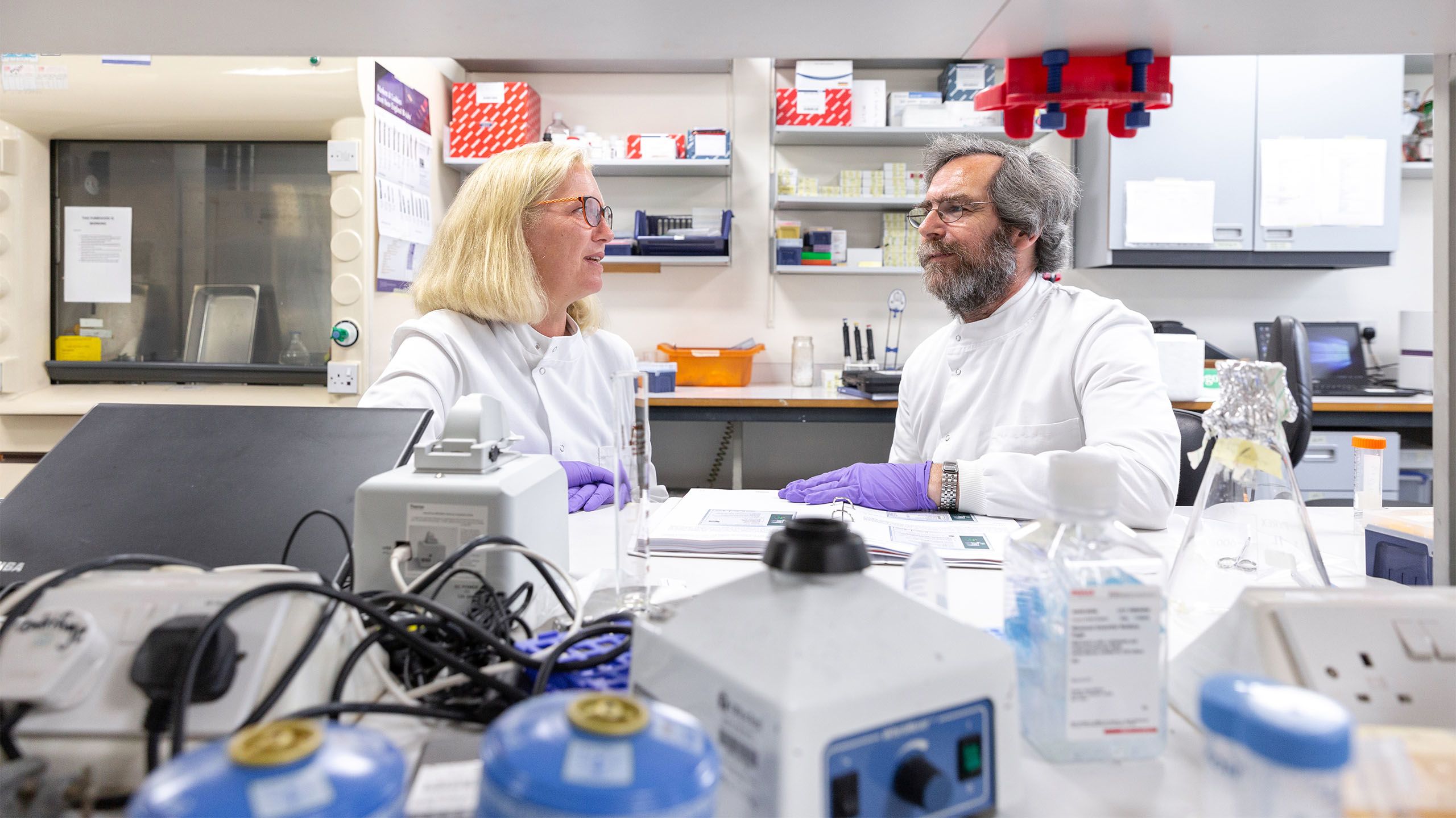 Jane Apperley, Professor of Haemato-oncology at Imperial and Clinical Director of Clinical Haematology at the Imperial College Healthcare NHS Trust, researches cell therapies such as CAR-T. She is pictured here with Shab Uddin, head of processing, with a machine used for CAR-T therapy. Photo: Thomas Angus