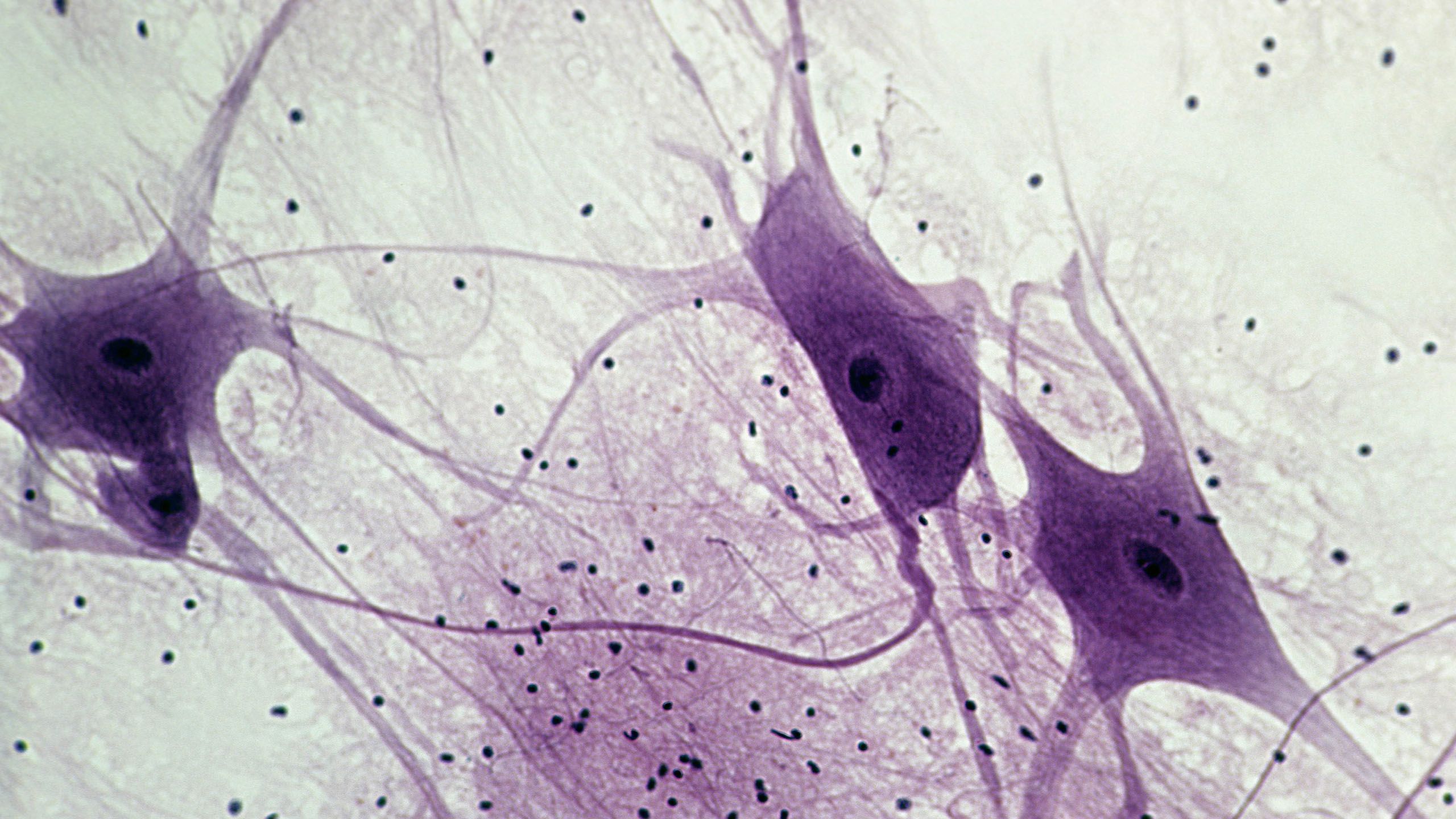 Close-up photo of neurons in the spinal cord. Professor Simone di Giovanni has identified a gene involved in regenerating dorsal root neurons following spine injury. This could eventually be harnessed in a gene therapy.