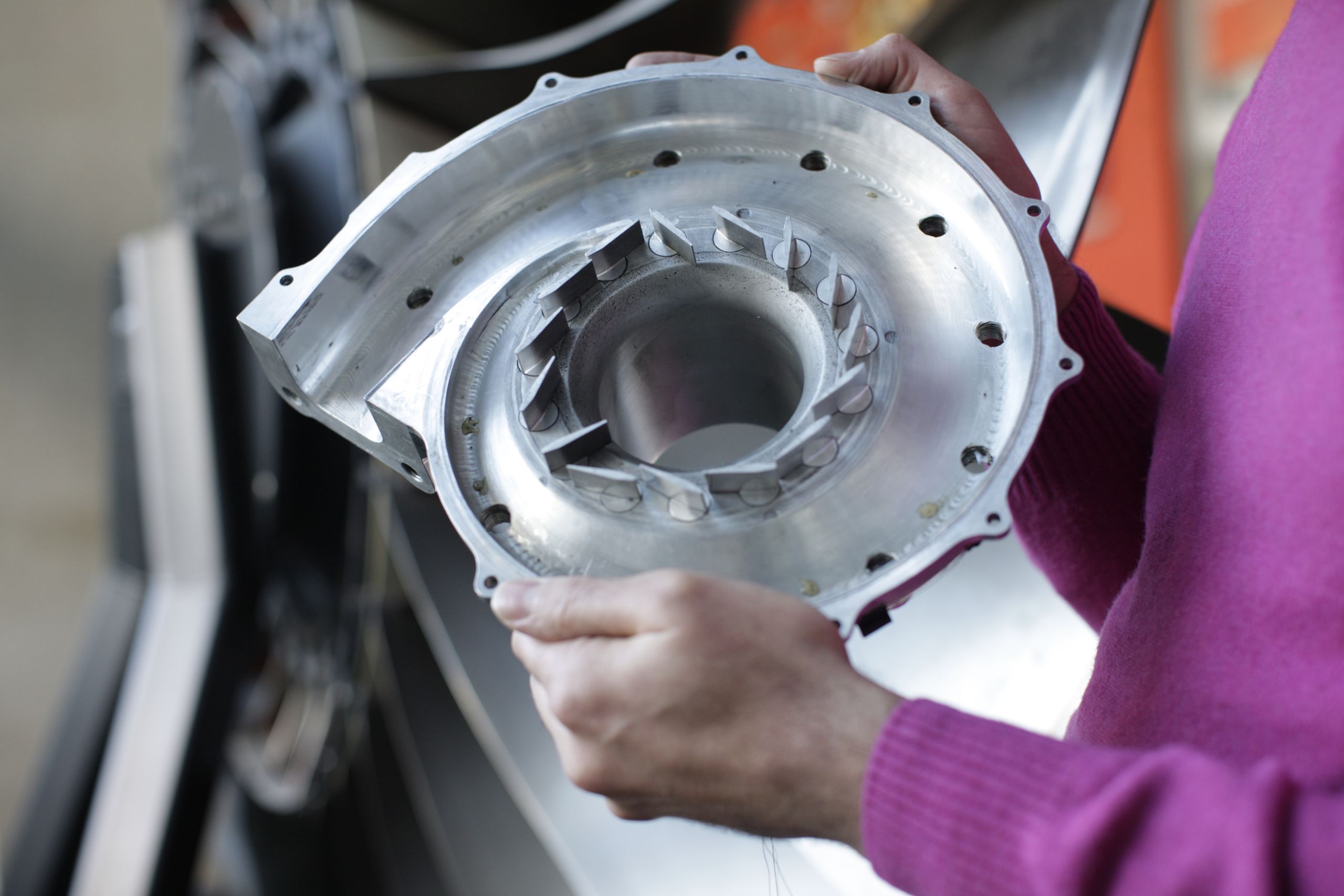 Professor Ricardo Martinez-Botas displays an invention designed by Imperial's Turbocharger Group. This active component recovers energy that would otherwise be wasted in an internal combustion engine. Photo: Layton Thompson