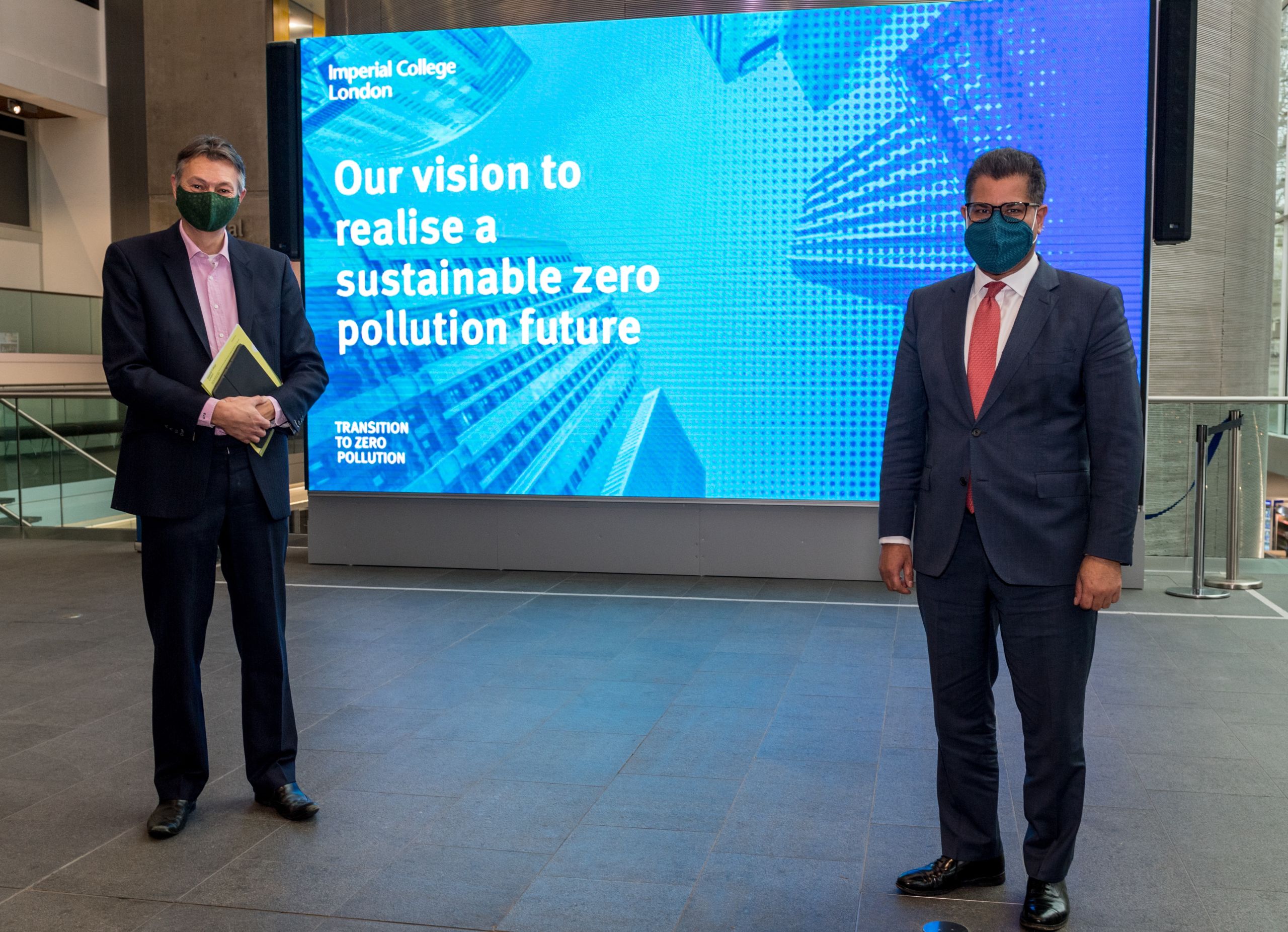 Professor Nigel Brandon welcomes Alok Sharma - then Business and Energy Secretary and current COP26 President - to Imperial in December 2020 to launch the government's Energy White Paper and hear about Imperial's Transition to Zero Pollution initiative