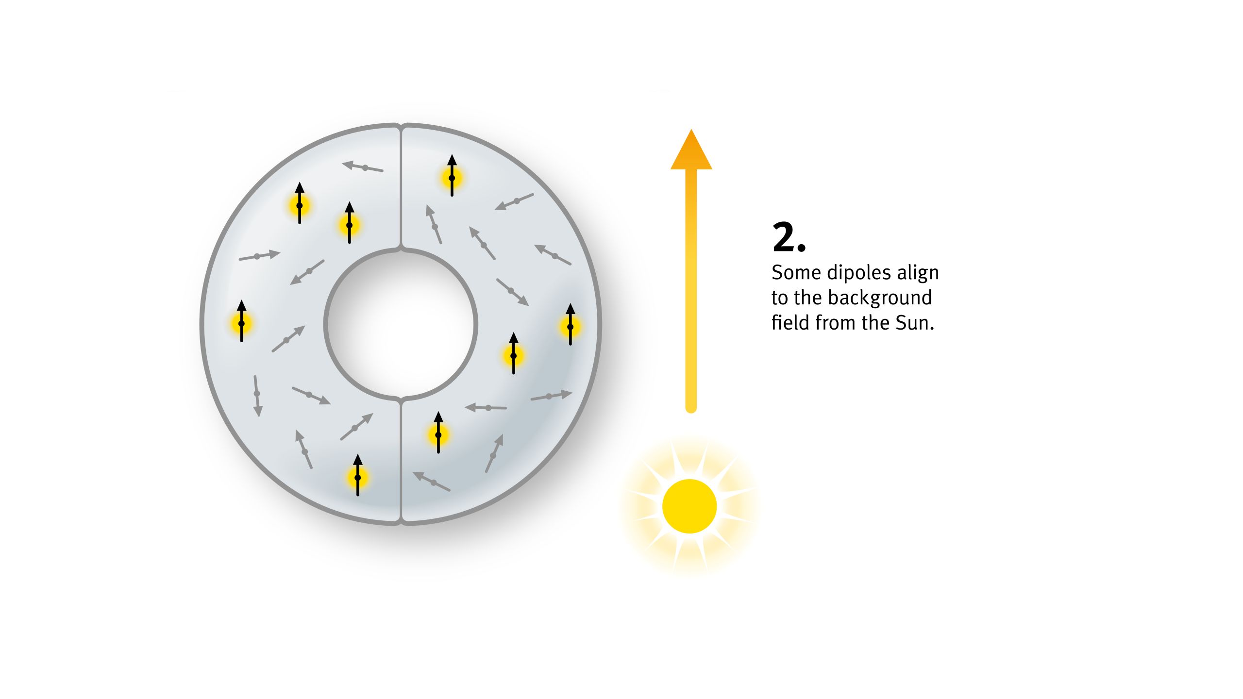 The instrument is known as a fluxgate magnetometer. It's made up of a circular magnetic core (grey, below) in two halves. The core is made up of a material sensitive to magnetism, where many of its atoms act like tiny magnets, called dipoles.