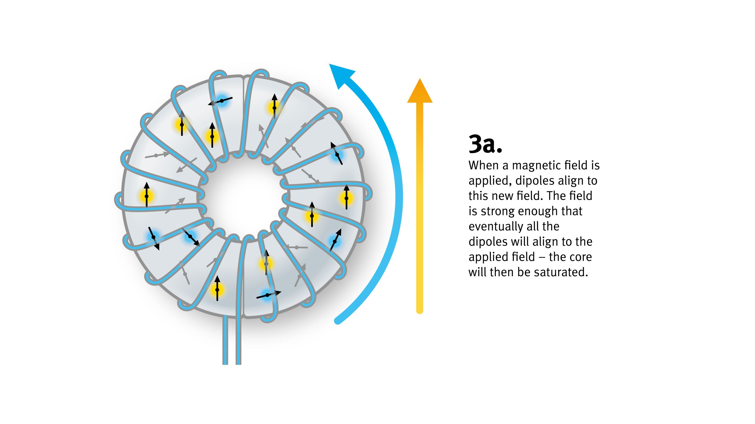 A wire coil (blue) wraps around the core, capable of inducing a magnetic field. Finally, there is a rectangular wire wrap (orange) that senses the action of the dipoles.
