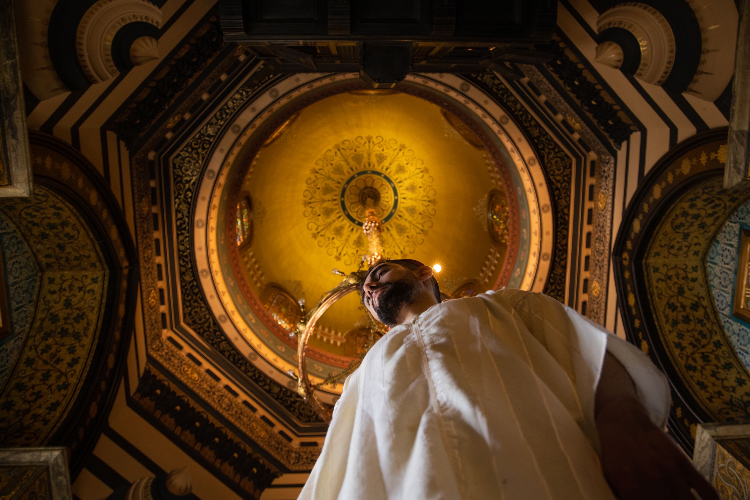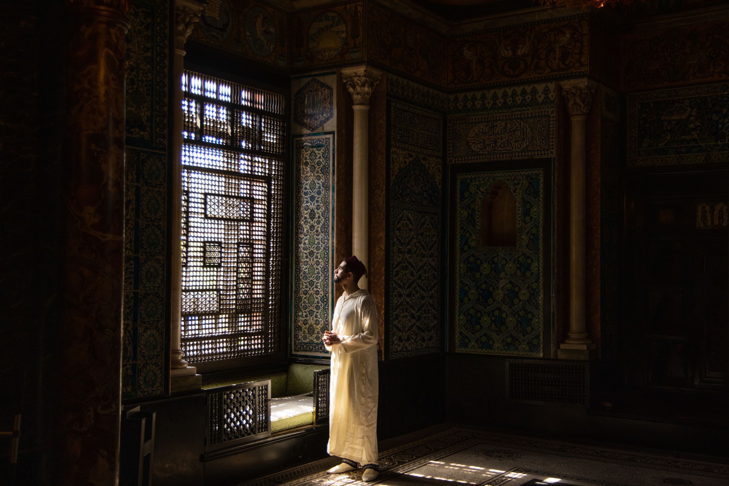Riad has been photographed in the Arab Hall at Leighton House Museum.