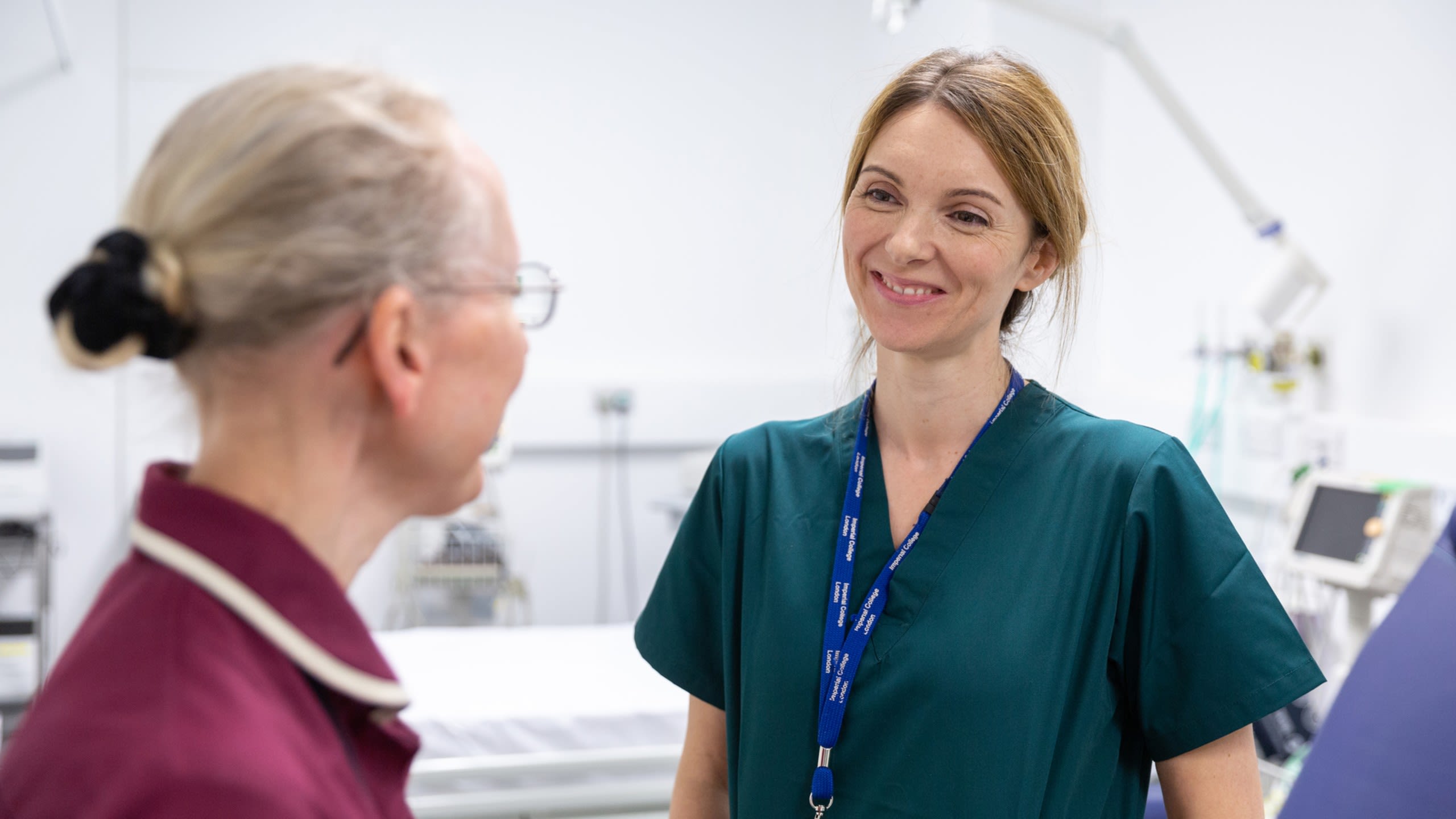 Woman in green top talks to colleague in clinical setting