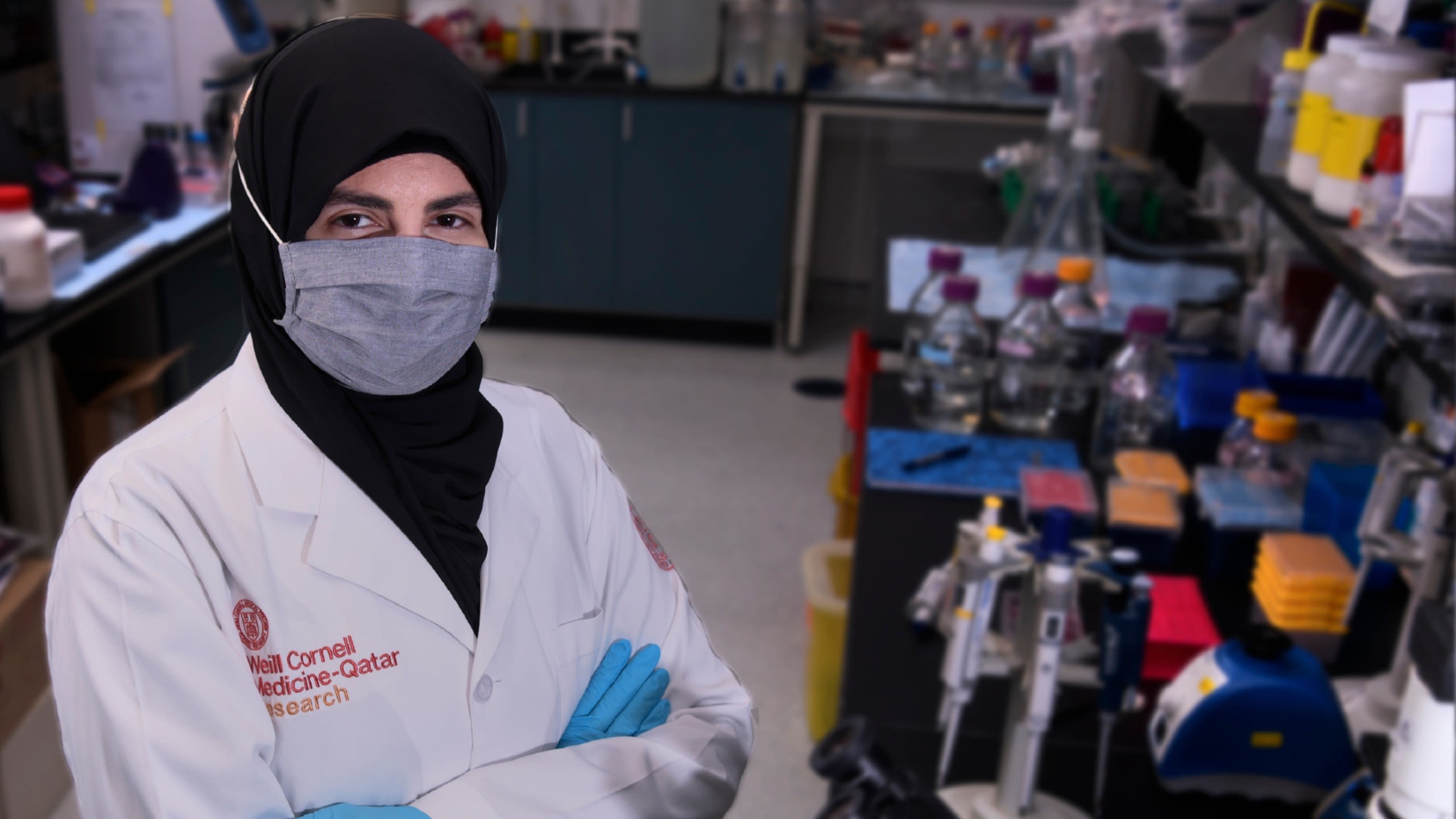 Dr Isra Marei stands in lab wearing face mask, lab coat and gloves poses for a picture with hands folded across her chest.