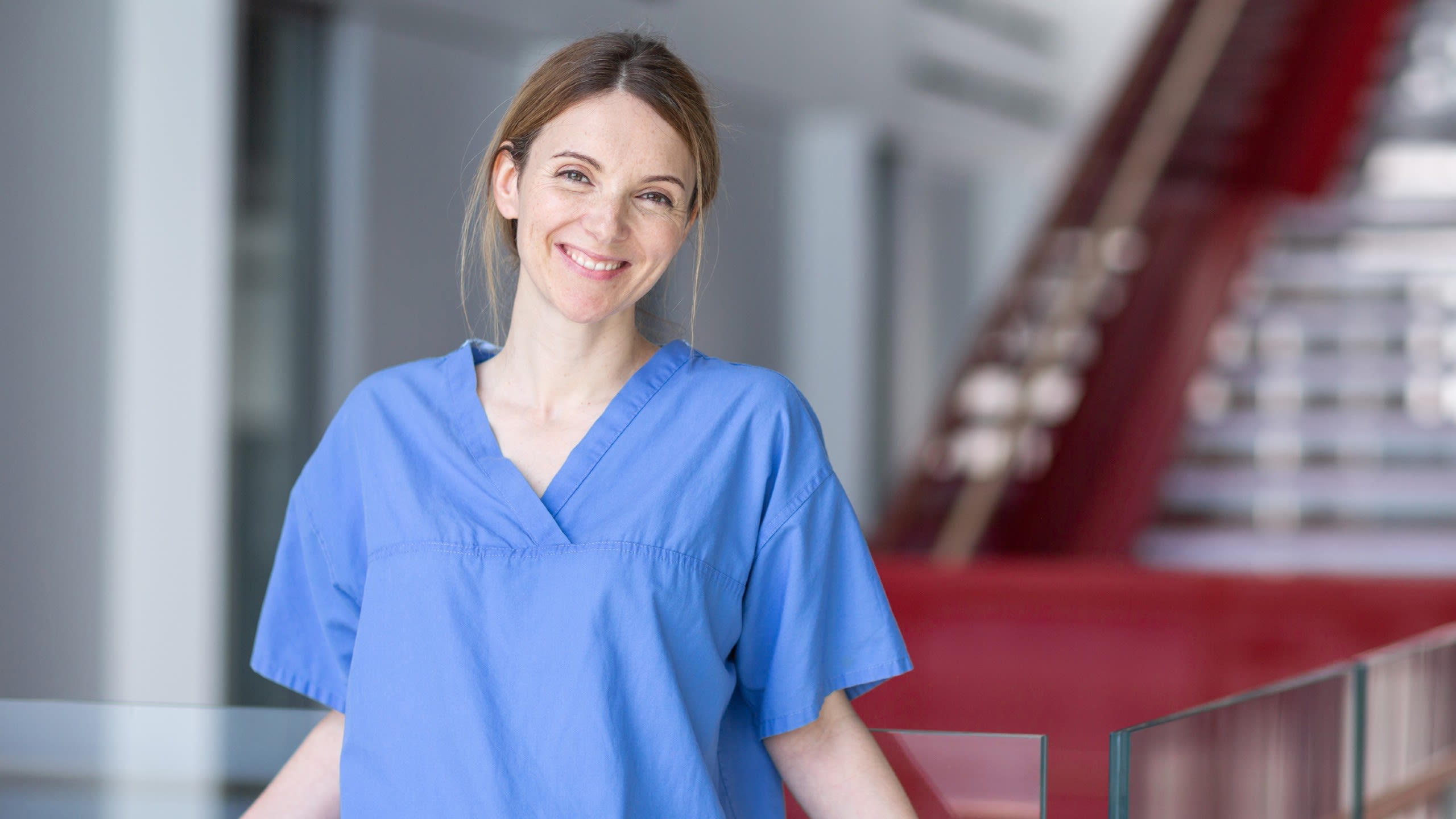 Women sits on chair in hospital setting - wearing a green top, hands folded, smiling at a camera in a clinical setting.