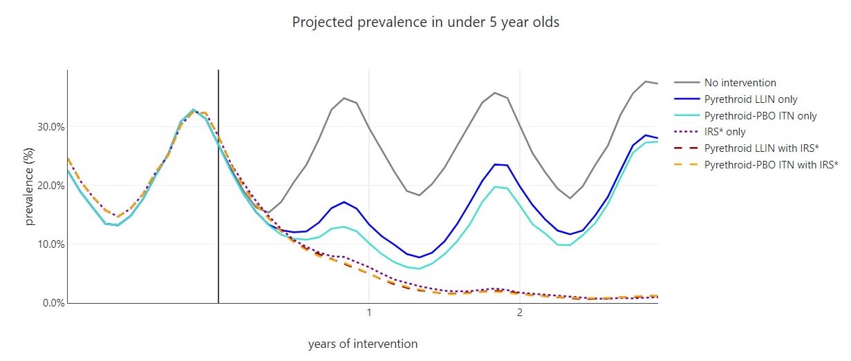 The outcome of MINT modelling given specific inputs including population size, seasonality, current malaria prevalence, how often mosquitoes like to bite, and levels of insecticide resistance. The graph shows the potential effect on the prevalence of infection in children under five years of age given a range of interventions including different insecticides