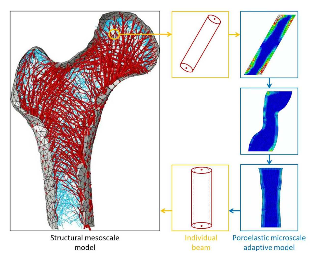 A microscale poroelastic model of a single trabecular element was generated. An optimisation algorithm driven by fluid flow velocity was implemented which allows prediction of single trabecula shape and orientation adaptation under loading. This microscale modelling approach was used to design a surrogate model allowing prediction of trabecular cross-section and orientation in a structural model, effectively combining the accuracy of the microscale poroelastic model and the computational efficiency of the mesoscale structural model. Figure 1 shows the concept of this multi-scale modelling approach.