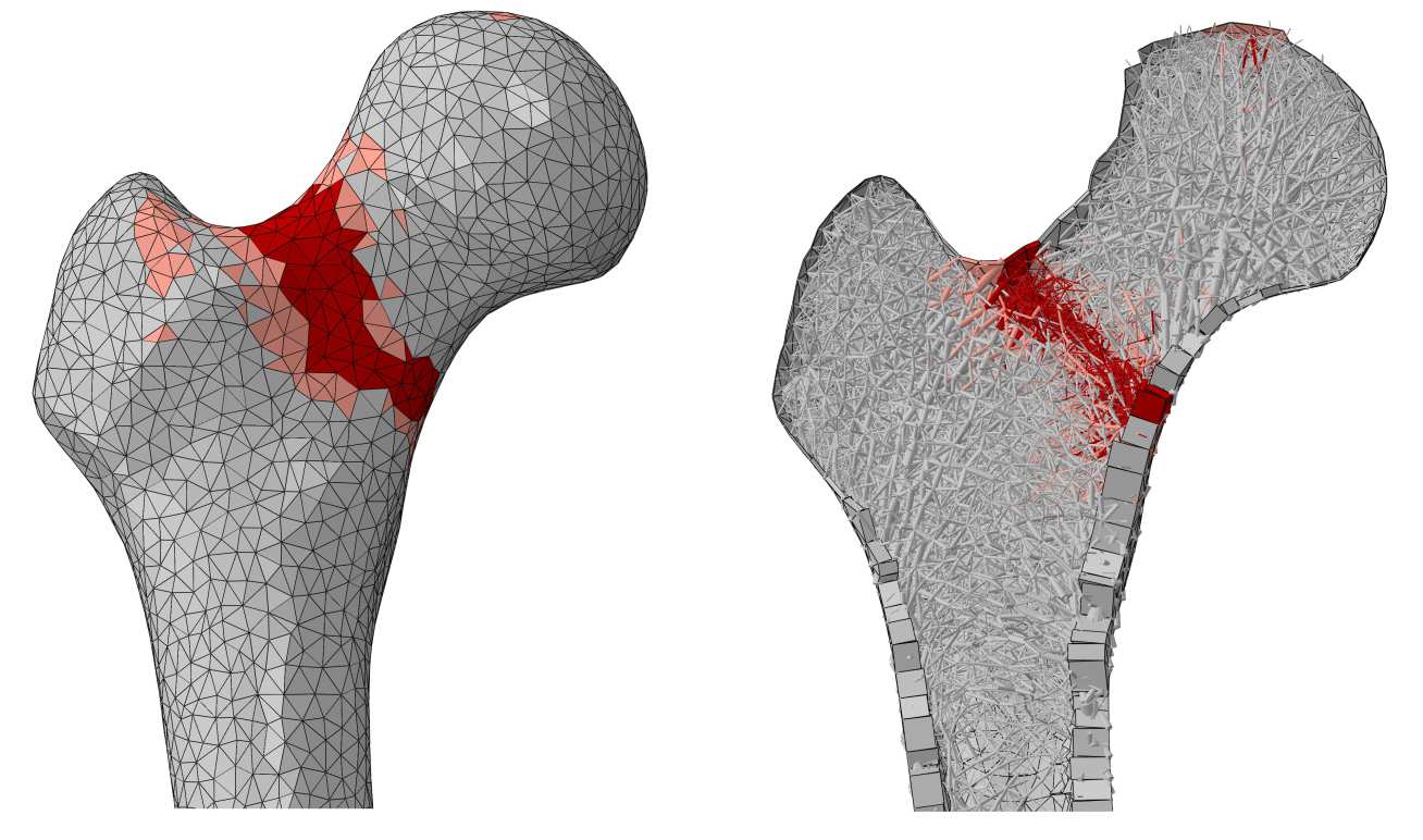 A strain-rate and age-dependant damage elasto-plasticity material model for bone, for use in structural FE simulations, has been implemented which allows prediction of fracture onset and development, in both static and dynamic scenarios. Scenarios tested so far include longitudinal compression of the femur and fall to the side. Figure 1 shows a femoral fracture pattern in longitudinal compression scenario.