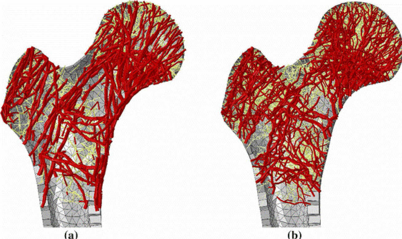 The main features characteristic of femoral inner structure are well predicted in the model: thick shaft cortex, distal distribution of trabecular bone, directionality of the proximal trabecular group (primary compressive, primary tensile, secondary compressive, secondary tensile, greater trochanter group), Ward’s triangle in the neck. An important advantage of this model is its computational efficiency, with a running time of the order of one minute on a desktop computer for a simple load case.