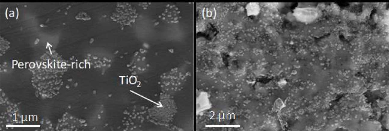 Figure 1. SEM images of 20 wt.% waste loading HUPed Synroc-Z samples with (a) 1 um and (b) 15 um polishing finish. The TiO2 particles compact on perovskite-rich regions. Samples with 15 um polished shows dispersed TiO2 skin but dense in some edges of holes.