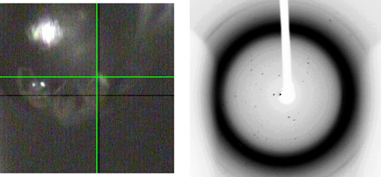 The image above shows a number of old lysozme crystal grown and shot in a regular MRC plate. On the left, you can see spots extending to 3Å. This won't give you a respectable new structure but the confidence to go ahead with these crystals.